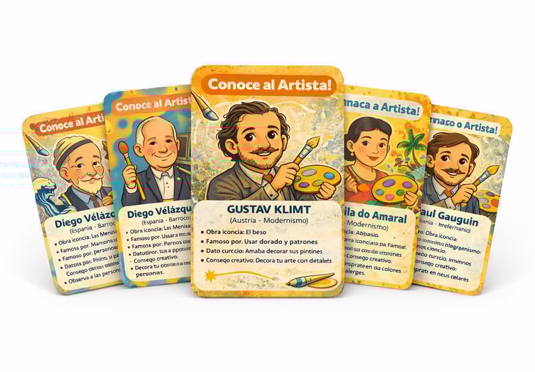 Tarjetas ilustradas con información breve y curiosa sobre los grandes nombres del arte. Ideales para usar como juego, consulta o exhibición en casa o en el aula.