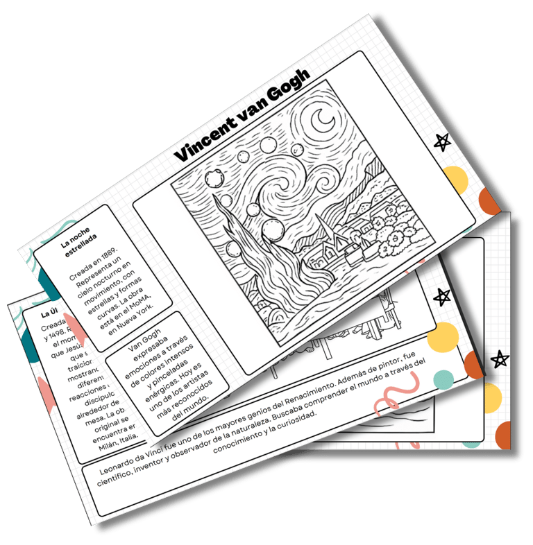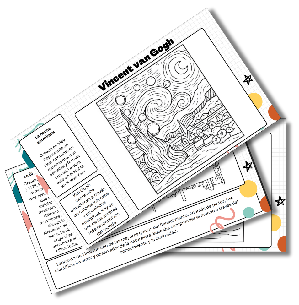 A través de versiones infantiles inspiradas en grandes obras de la historia del arte, los niños tienen contacto con nombres como Van Gogh, Da Vinci, Picasso, Monet, entre muchos otros — sin complejidad, sin presión y sin pantallas.