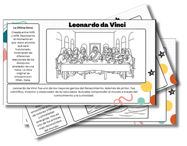 Tarjetas ilustradas con información breve y curiosa sobre los grandes nombres del arte. Ideales para usar como juego, consulta o exhibición en casa o en el aula.